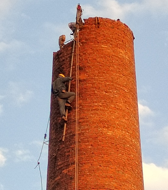 2、地面設(shè)安全警戒線,施工人員安全通道及場地清理。在煙囪底部外壁向外直徑20米范圍內(nèi)做好防護(hù)警戒線,通往煙囪爬梯的過道搭好施工人員的安全通道,周圍區(qū)域設(shè)置專人看護(hù),同時地面人員整理路地及機(jī)械設(shè)備安置整理。