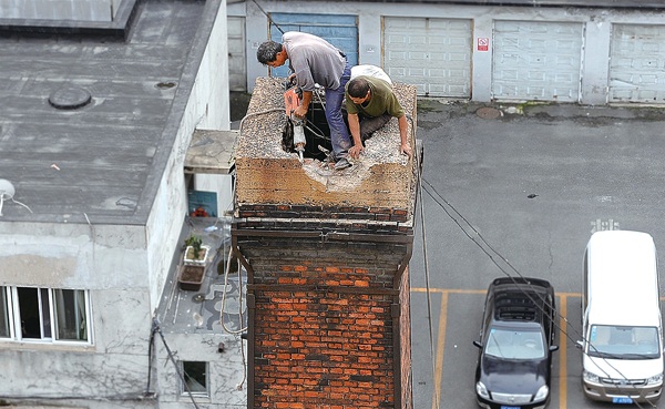 2、當(dāng)上一段面操作完成后,拆除欄桿、安全網(wǎng)、木板支架等,移至下一段面進(jìn)行施工,依次類推進(jìn)行整個(gè)拆除施工過程。 3、拆除階段:從頂部向下拆除,首先開U型口,先用手錘將墻壁開口后,再用千斤頂撬開后,再用手錘改成小塊,在指定位子往下拋,由上而下慢慢拆除,下面有專人看護(hù),在施工范圍內(nèi)不得有非高空作業(yè)人員進(jìn)入,登高操作人員都配戴保險(xiǎn),都保在爬梯上扣牢,確保安全。因高空拆除下來的磚塊易飛濺墜落,必須在煙囪下面四周規(guī)定區(qū)域內(nèi),設(shè)置遮覆隔離工作,特別是貼近煙囪的隔壁房子做好安全保護(hù)措施,以煙囪為中心向兩側(cè)延伸防護(hù)位置,做全面防護(hù),地面看護(hù)人員不得離開現(xiàn)場,確保拆除下來的磚塊安全落地。