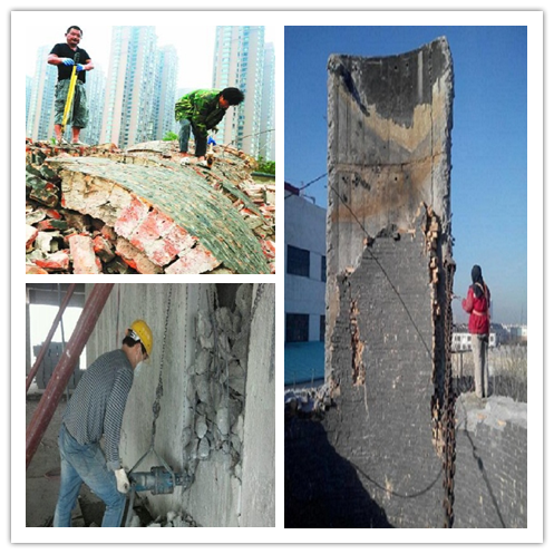 煙囪內(nèi)襯為12cm厚的耐火磚組成,強度較大,為了確保倒塌方向的準(zhǔn)確性,在破碎切口時,應(yīng)同時將內(nèi)襯破碎。