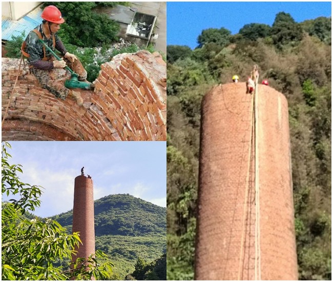 1、拆除煙囪施工人員進現(xiàn)場首先將登高的爬梯逐個檢查。
