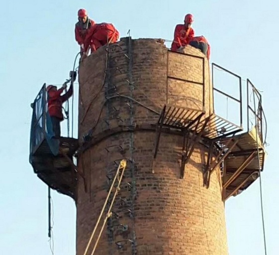 2、地面設(shè)安全警戒線,施工人員安全通道及場(chǎng)地清理。在煙囪底部外壁向外直徑20米范圍內(nèi)做好防護(hù)警戒線,通往煙囪爬梯的過(guò)道搭好施工人員的安全通道,周圍區(qū)域設(shè)置專人看護(hù),同時(shí)地面人員整理路地及機(jī)械設(shè)備安置整理。