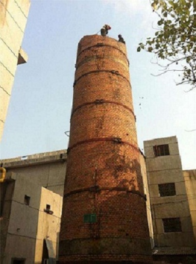 1、拆除煙囪高度達(dá)60米,一層平臺(tái)向上部分筒身為磚砌結(jié)構(gòu),筒身腐化嚴(yán)重,且頂口多處開裂,裂縫寬度4-10厘米不等,隨時(shí)有崩塌危險(xiǎn),固采用人工拆除時(shí)需在煙囪頂部2米做加固處理,為避免較大震動(dòng)人工拆除采用的工具主要為電錘,震動(dòng)相對較小,進(jìn)度相當(dāng)緩慢,工作量巨大。