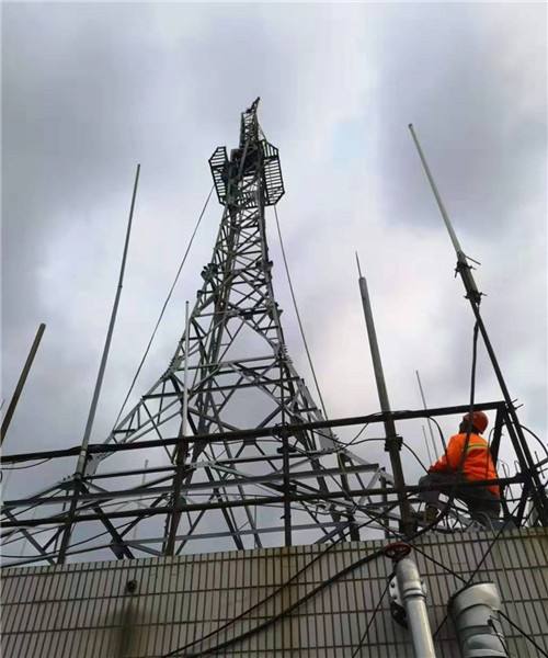 2、根據(jù)該基站在城區(qū)電信大樓上,無法選擇好合理位置打下纜風(fēng)樁,拔桿選用站角形,與塔中心固定拔桿相比無需纜風(fēng)繩。在塔上安裝固定好拔桿,系好拔桿與塔身主材連接鋼絲繩。