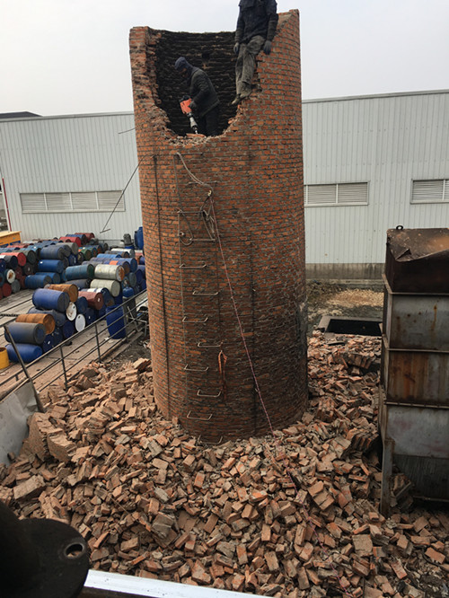 1、拆除煙囪高度達(dá)60米,第1層平臺(tái)向上部分筒身為磚砌結(jié)構(gòu),筒身腐化嚴(yán)重,且頂口多處開(kāi)裂,裂縫寬度4-10厘米不等,隨時(shí)有崩塌危險(xiǎn),固采用人工拆除時(shí)需在煙囪頂部2米做加固處理,為避免較大震動(dòng)人工拆除采用的工具主要為電錘,震動(dòng)相對(duì)較小,進(jìn)度相當(dāng)緩慢,工作量巨大。