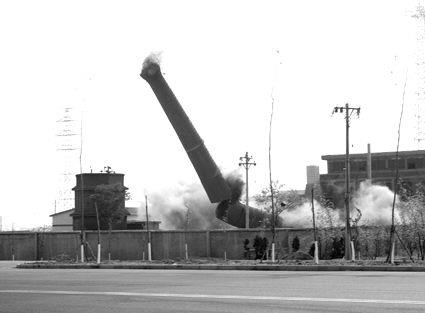 “10、9……3、2、1,爆破!”隨著現(xiàn)場爆破總指揮的一聲令下,今天下午15時17分,煙臺發(fā)電廠一發(fā)電機組煙囪在5秒鐘內(nèi)爆破拆除。然而,本次爆破卻出現(xiàn)了失誤,爆破后的煙囪向南傾倒,砸倒發(fā)電廠南面部分墻體,砸斷水管,同時受損的還有一桿路燈以及化工路路面。東營煙囪拆除-東營廢棄煙筒爆破